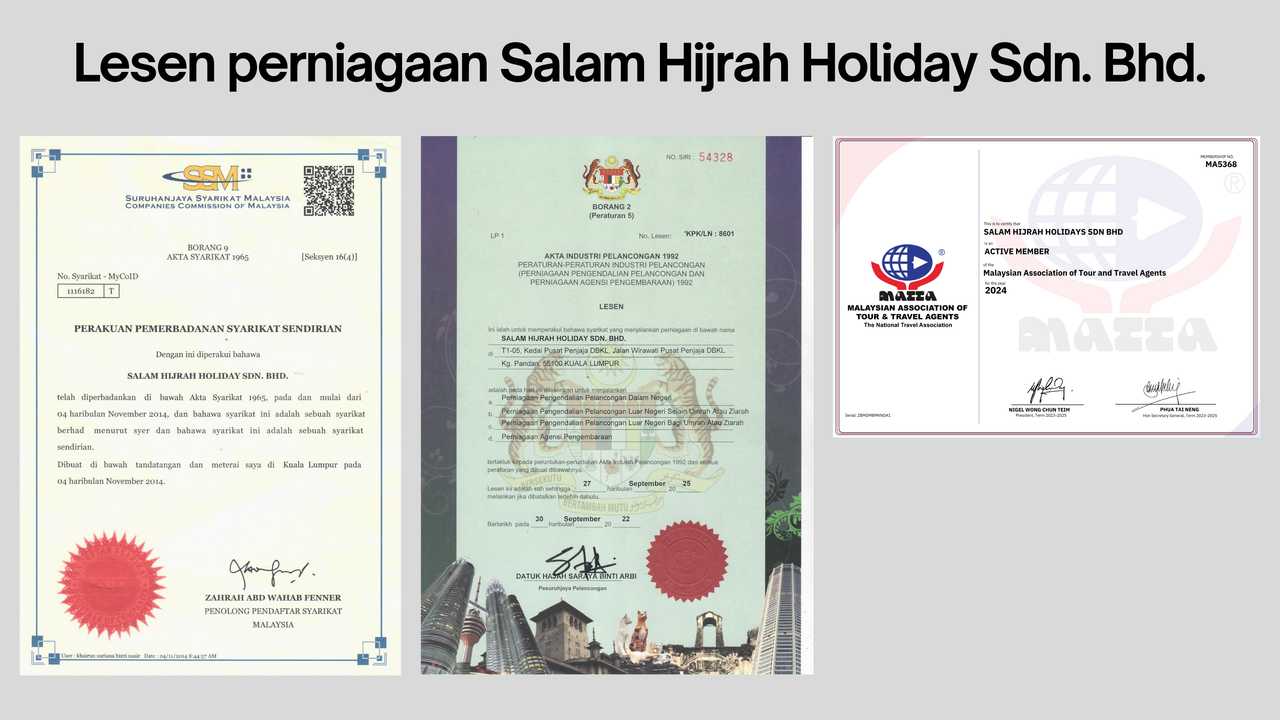 Salam Hijrah Holiday Sdn. Bhd. (SHH) adalah syarikat pelancongan yang didaftarkan di bawah Suruhanjaya Syarikat Malaysia (SSM) pada tahun 2014 dan berlesen sah untuk operasi pelancongan (Nombor Pendaftaran Syarikat (SSM) : 1116182-T) yang didaftarkan di bawah Kementerian Pelancongan, Seni & Budaya Malaysia (Ministry of Tourism, Arts and Culture - MOTAC) (nombor lesen MOTAC : KPK/LN 8601).